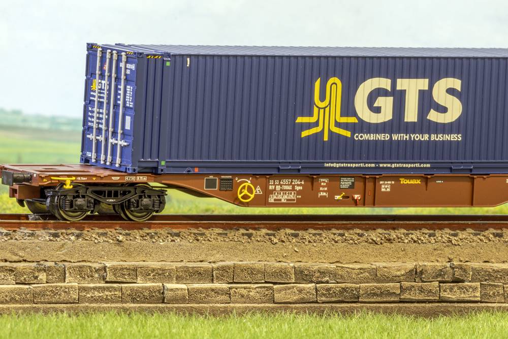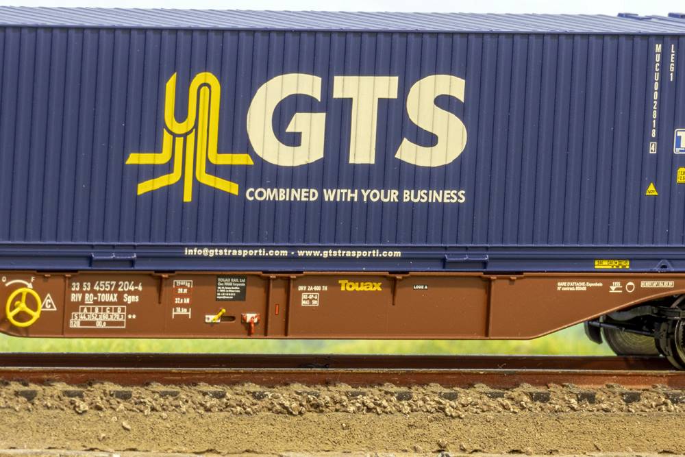 Vagon intermodal Sgns si container GTS. Vagon cu Nr. 33 53 RIV RO-TOUAX 4557 204-4. Vagon de constructie metalica, se livreaza cuple standard