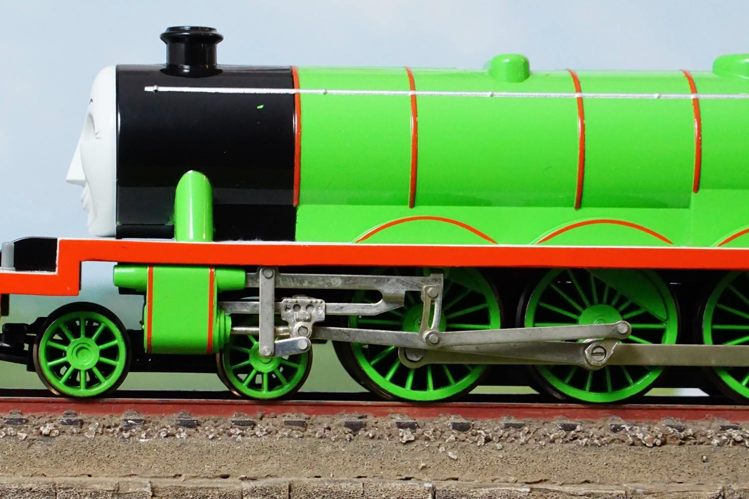 Locomotiva "Henry" din celebra serie "Thomas and friends", motor montat in cazan, tractiune pe trei axe, ochii se misca simultan cu rulajul locomotivei. Ruleaza pe sine standard H0, cuple specifice pentru scara 00, interfata digitala NEXT18. Se livreza in blister