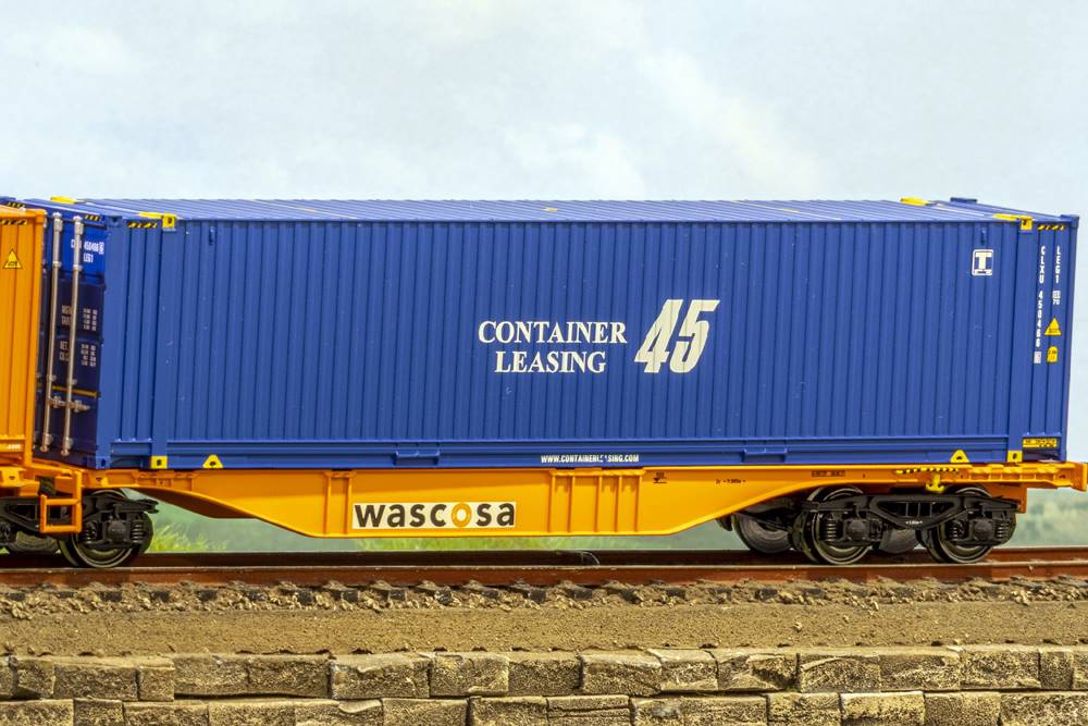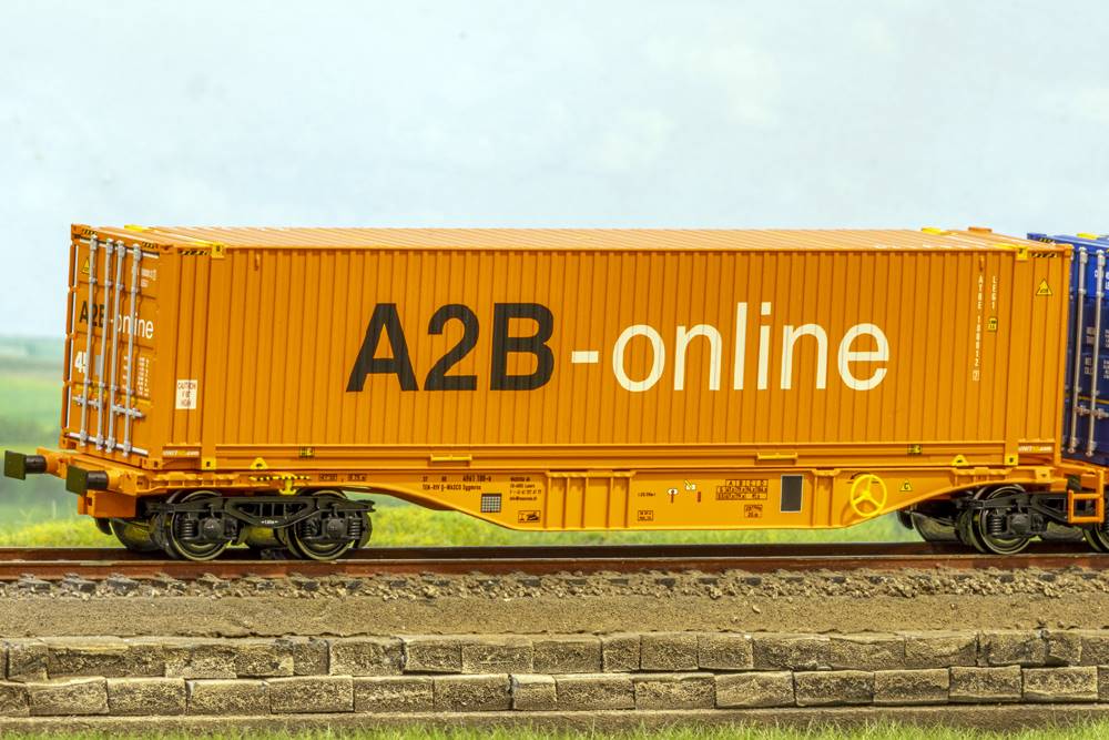 Vagon intermodal Sggrmms 90 si containere A2B si CL 45. Vagon cu Nr. 37 80 TEN-RIV D-WASCO 4961 108-0. Vagon de constructie metalica, se livreaza cuple standard