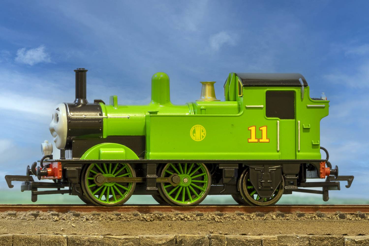 Locomotiva "Oliver" din celebra serie "Thomas and friends", motor montat in cazan, tractiune pe trei axe, ochii se misca simultan cu rulajul locomotivei. Ruleaza pe sine standard H0, cuple specifice pentru scara 00. Se livreza in blister