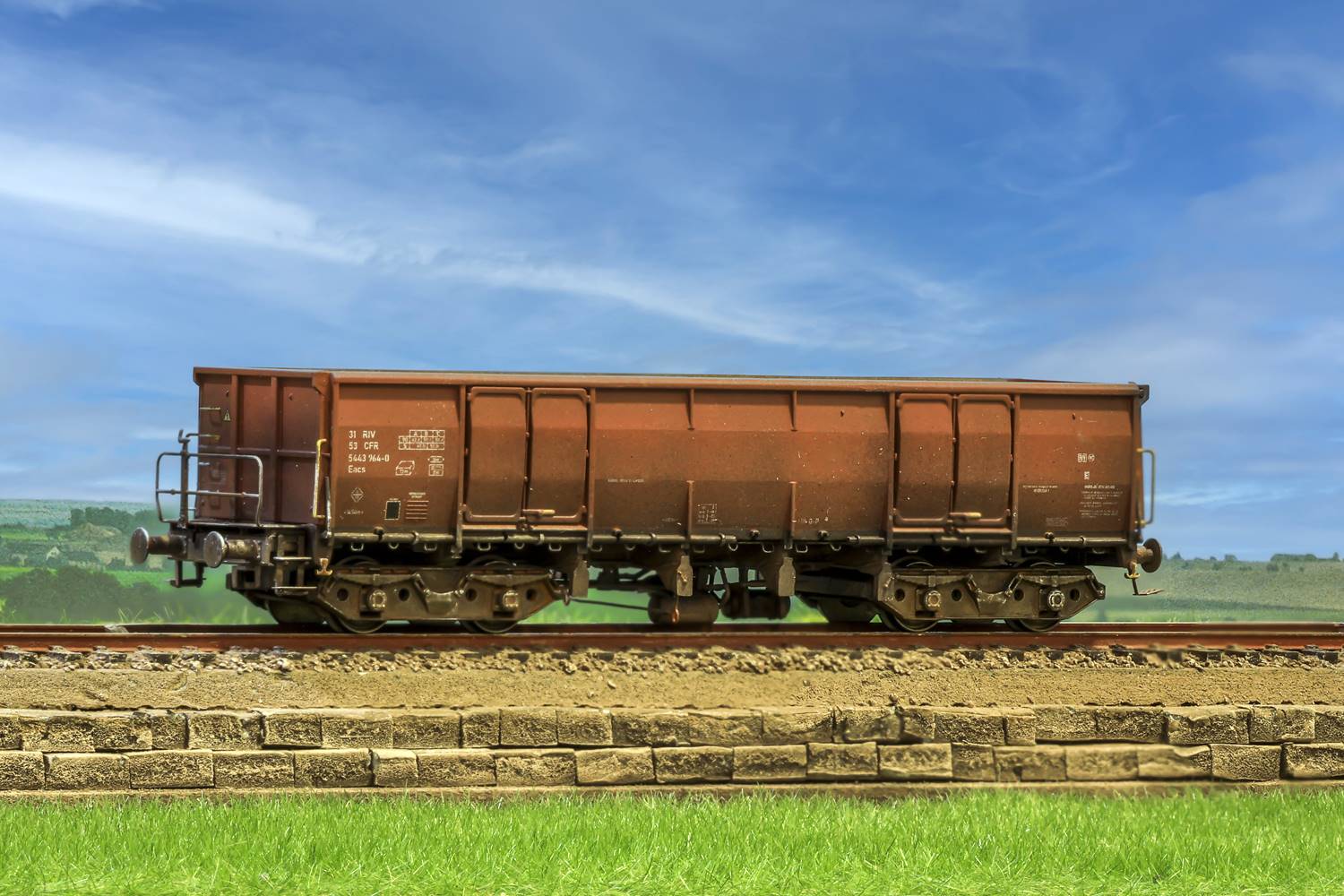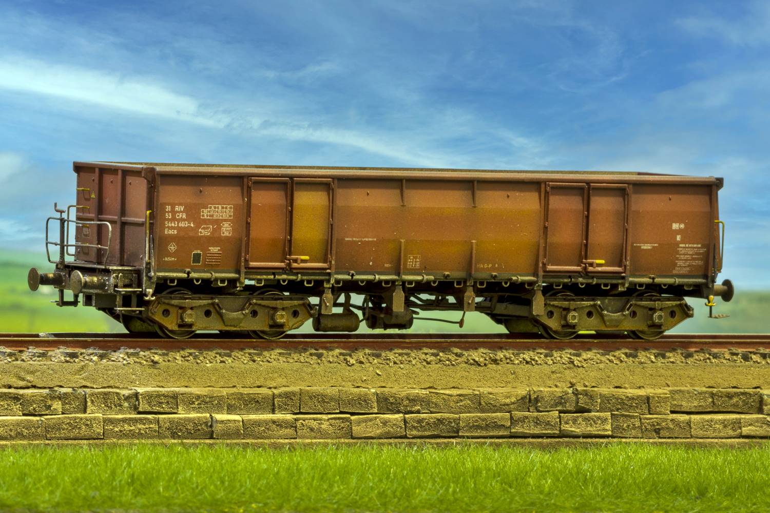 Vagonele de tip Eacs sunt vagoane descoperite, cu pereti inalti, utilizate pe scara larga de CFR pentru transportul marfurilor vrac, fabricate intre 1965 si 1999, face parte din familia vagoanelor standardizate UIC. La CFR, vagoanele Eacs au fost introduse in principal in anii 70 - 80, ca raspuns la cresterea transportului de carbune, minereuri, piatra sparta, cocs, nisip si alte materiale grele. Ele au inlocuit treptat modele mai vechi, oferind o capacitate mai mare de incarcare, o constructie mai robusta si posibilitatea de descarcare rapida (prin basculare sau cu utilaje), fiind intalnite in garnituri de pana la 50 vagoane. Din punct de vedere tehnic, vagonul Eacs se caracterizeaza prin structura metalica sudata, 4 osii, sarcina utila mare. De-a lungul timpului, CFR a exploatat mai multe subtipuri Eacs, dupa 1990, aceste vagoane au ramas esentiale in transportul feroviar de marfa, fiind modernizate sau mentinute in exploatare datorita fiabilitatii si simplitatii constructive. Setul nostru este compus din vagoane Eacs tip 1 (varianta originala) in diferite variante cu usi cu colturi drepte sau rotunde, cu roata de frana sau platforma pentru franar.