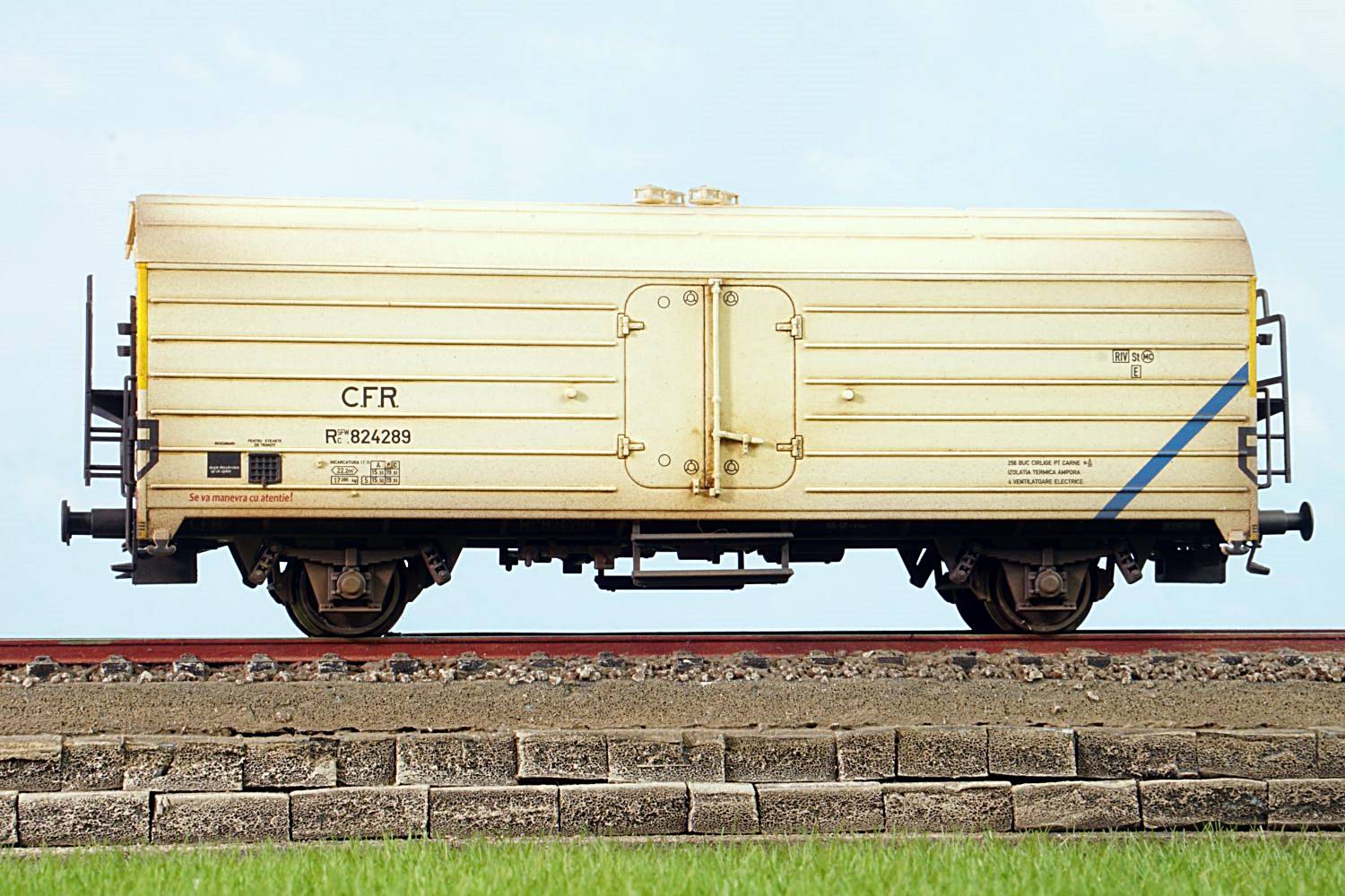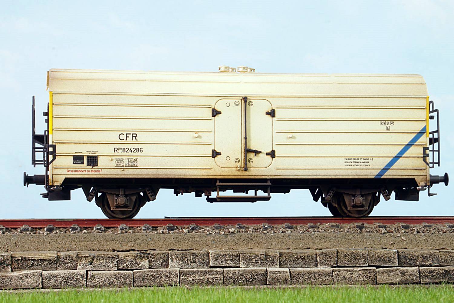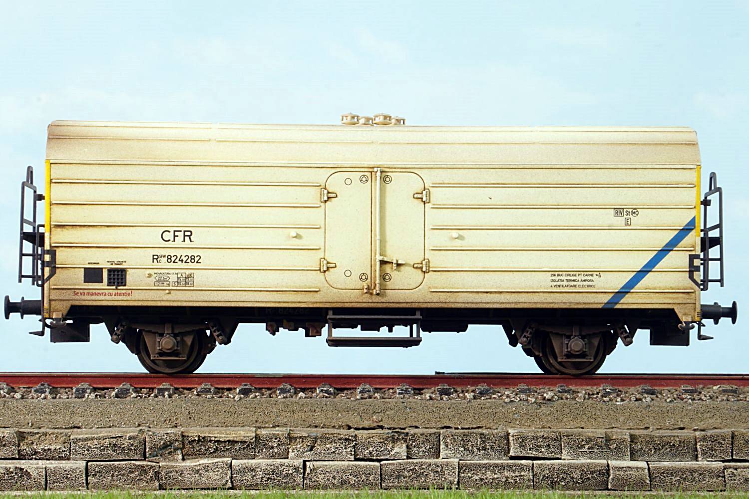 Set vagoane refrigerent Rsfwc 824282, 824286, 824289. Weathering profesional, fiecare vagon este unicat. Se livreaza cuple standard si accesorii vitrina.